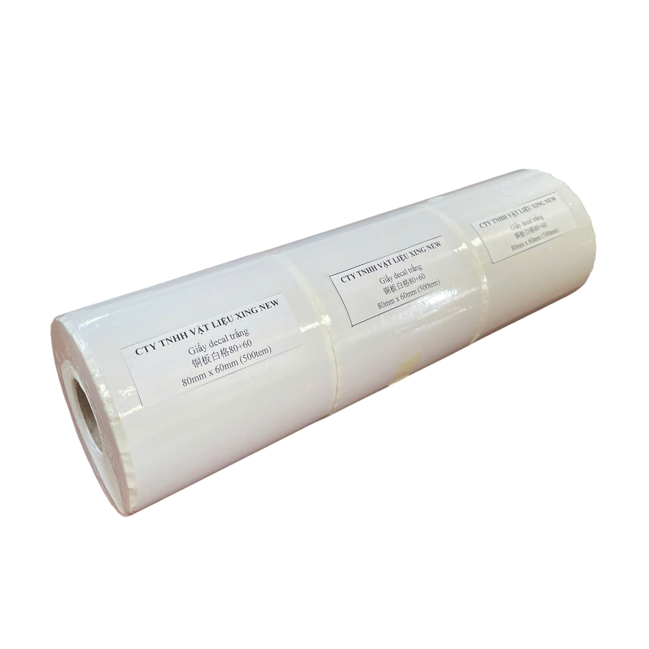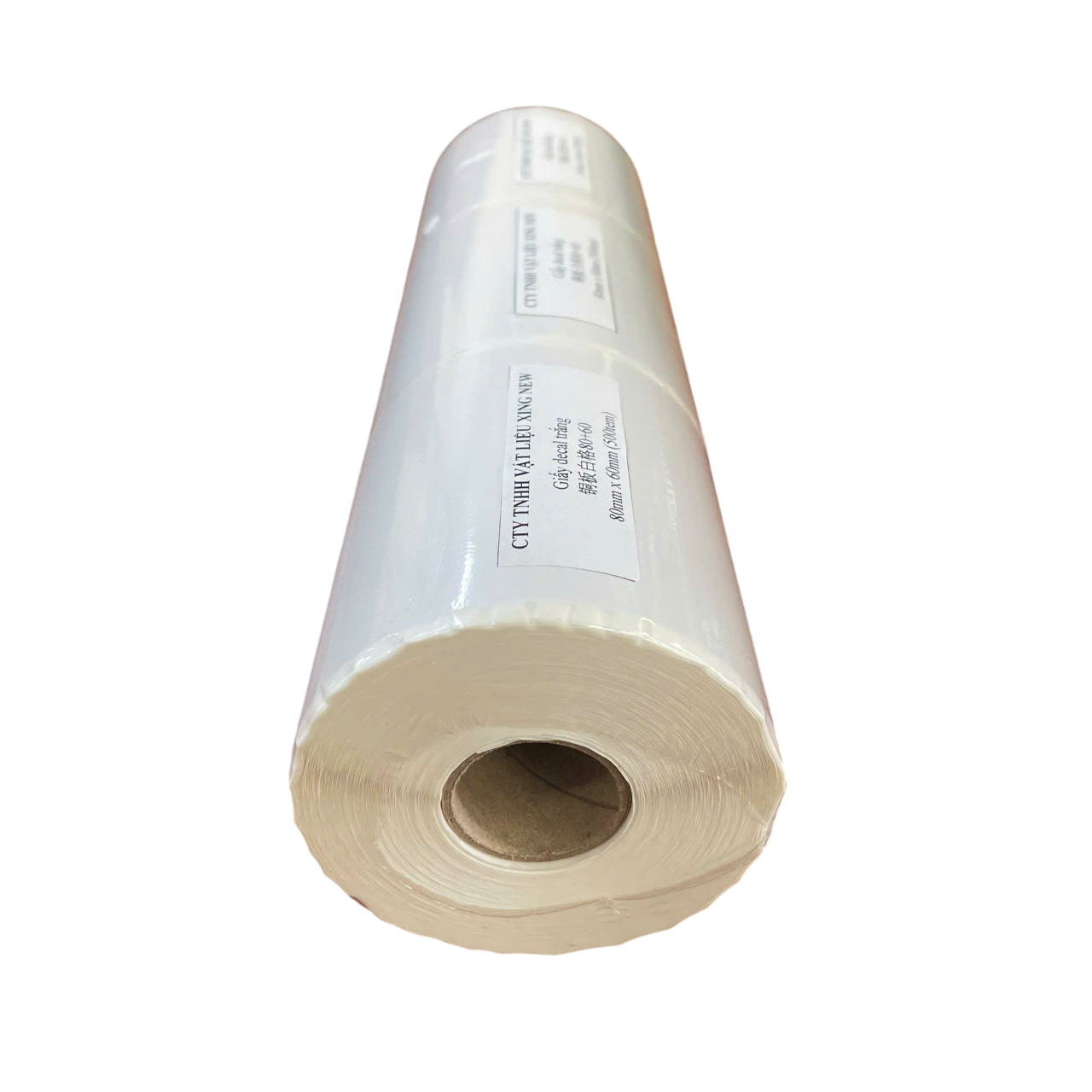 Với kích thước thành phẩm ngang 80mm, dọc 60mm, decal được bế sẵn theo khuôn và quấn thành cuộn, phù hợp để sử dụng cho các dòng máy in mã vạch (barcode). Tùy theo nhu cầu và cấu hình máy in, cuộn decal có thể được quấn với chiều dài 50m, 100m, 150m hoặc 200m. Lõi giấy quấn cuộn phổ biến có đường kính 26mm, 45mm hoặc 76mm, giúp khách hàng dễ dàng lựa chọn loại phù hợp với thiết bị in hiện có.